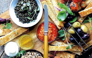 Snacksbräda med marinerade belugalinser, dukkah, getostkräm och surdegsbröd