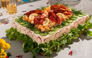 Räkfyllning: Spara en del av räkorna till garnering. Blanda resterande räkor med majonnäs, pepparrot, dijonsenap och dill. Salta och peppra efter smak.