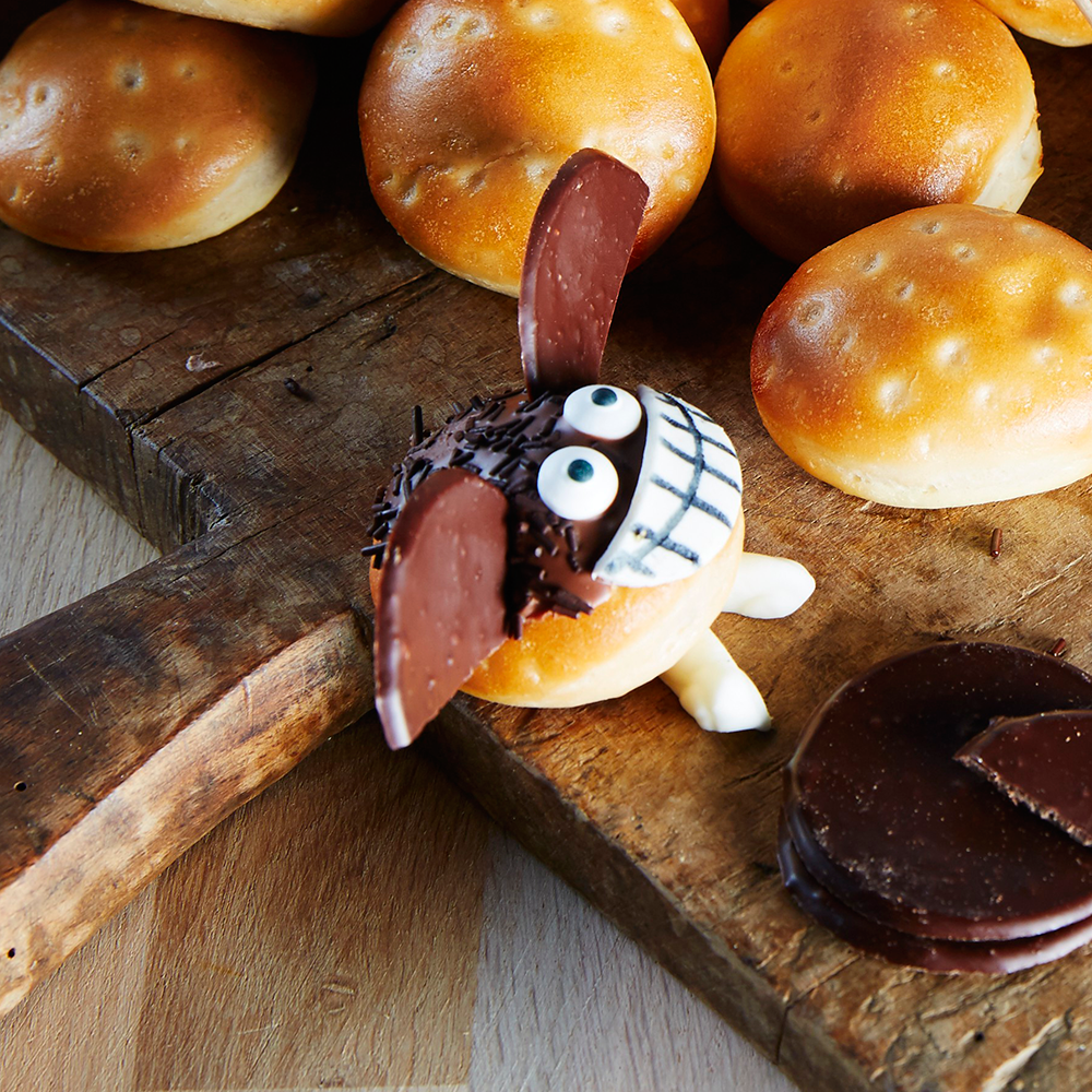 1 Vanillas-bulle, mörk blockchoklad, 2 st sockerögon, brunt strössel, vit sockerpasta, 1 skiva lövtunn choklad, ätbar svart färg, 1 st trätandpetare, 2 st vita godisbitar.