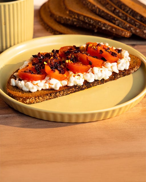 LingonGrova med Keso och skurna cocktailtomater, avsluta med chiliolja.