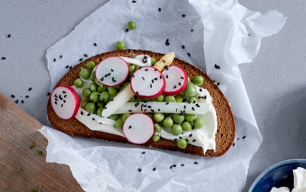 Läs merEn matig och god macka med färskost, ärtor, vit sparris och rädisor.