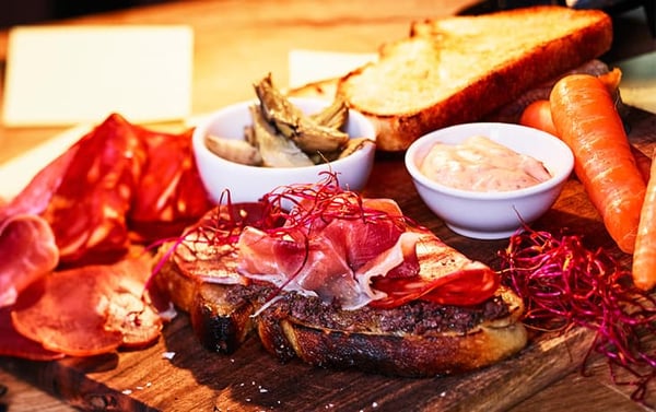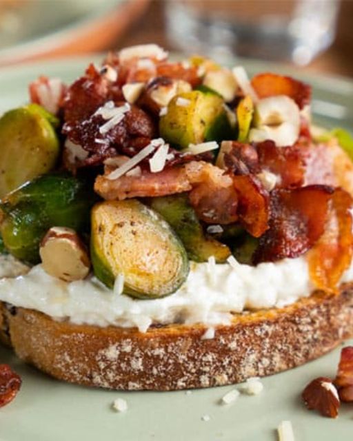Rostad RågLevain med krämig burrata, karamelliserad brysselkål och knaperstekt bacon